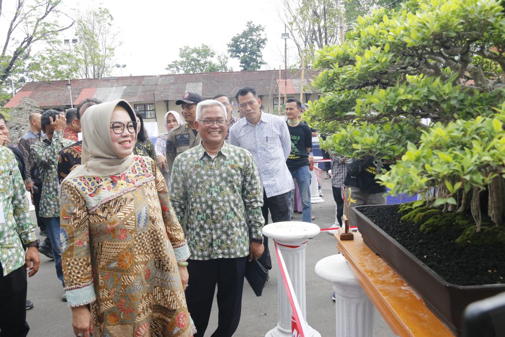 Bupati Sukoharjo, Etik Suryani membuka Kontes Bonsai Nasional Kalpataru III Tahun 2023 di Kompleks Stadion Gelora Merdeka, Jombor, Kecamatan Bendosari, Sabtu (8/7/2023). Kontes bonsai tersebut diselenggarakan oleh PPBI Cabang Sukoharjo.