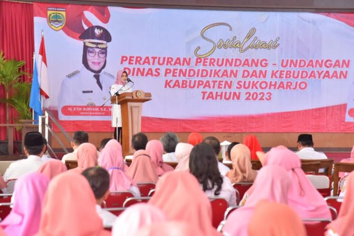 RILISJATENG.COM – Dinas Pendidikan dan Kebudayaan (Disdikbud) Kabupaten Sukoharjo menggelar Sosialisasi Peraturan Perundang-undangan Penguatan Pendidikan Karakter. Acara digelar di Graha PGRI dan dibuka oleh Bupati Sukoharjo, Etik Suryani, Rabu (8/3/2023).