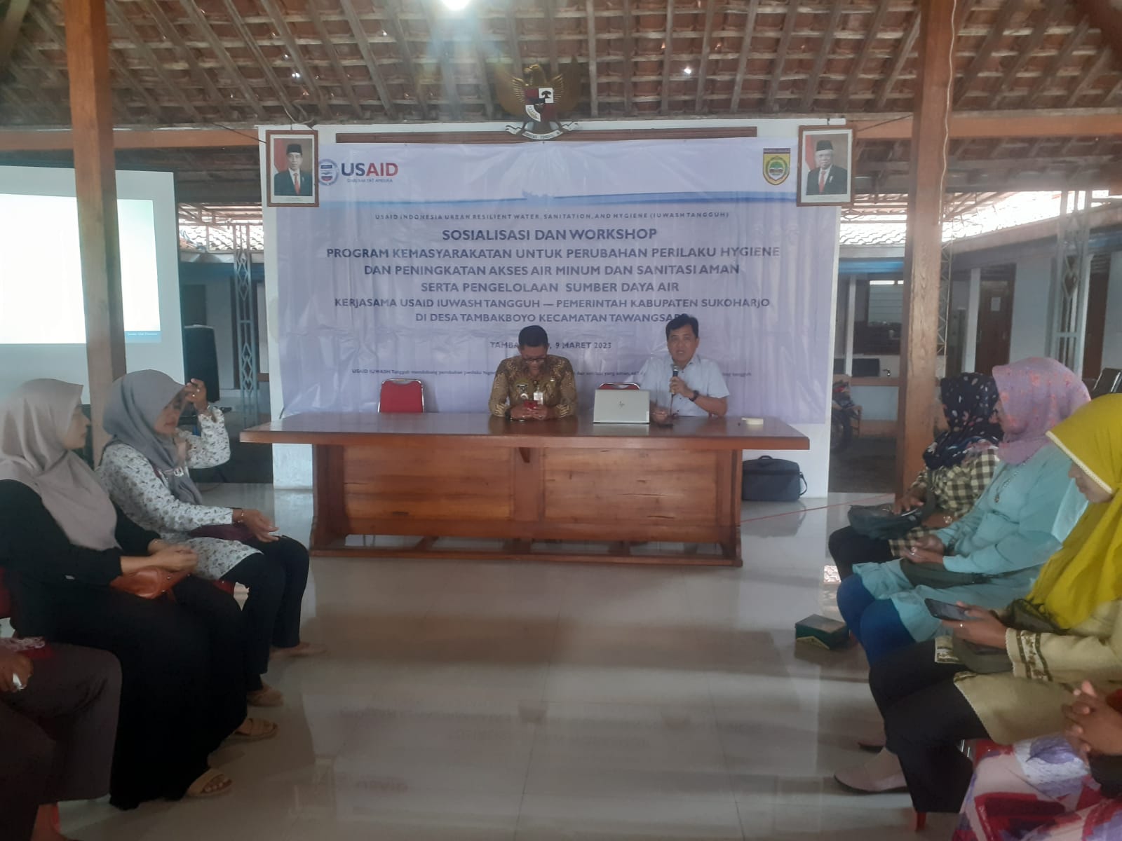 RILISJATENG.COM – Pemerintah Kabupaten Sukoharjo bekerja sama demgan Iuwash Tangguh mengadakan Sosialisasi dan Workshop Program Kemasyarakatan untuk Perubahan Perilaku Hygiene dan Peningkatan Akses Air Minum dan Sanitasi Aman serta Pengelolaan Sumber Daya Air, di Balai Desa Tambakboyo, Kec. Tawangsari Kabupaten Sukoharjo, Kamis 9/3 2023.