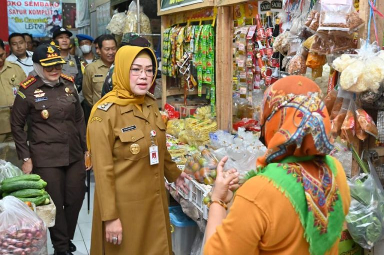 RILISJATENG.COM– Bupati Sukoharjo, Etik Suryani bersama pejabat Forum Koordinasi Pimpinan Daerah (Forkopimda) dan Tim Pengendali Inflasi Daerah (TPID) melakukan pantauan harga dan stok kebutuhan pokok masyarakat. Pantauan dilakukan di pasar tradisional dan juga pasar modern menjelang bulan suci Ramadhan, Senin (20/3/2023).