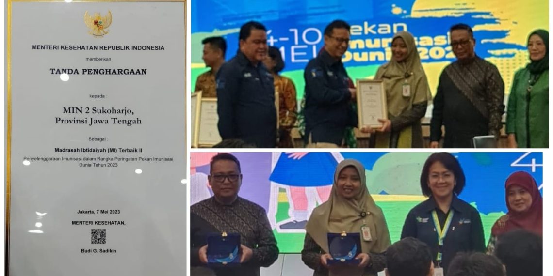 Kepala MIN 2 Sukoharjo, Wiretnoningsih Nurhayati, S.Pd., M.Si., bersama delapan Kepala Sekolah/Madrasah menerima Penghargaan Sekolah Sehat Imunisasi dari Menteri Kesehatan Republik Indonesia pada acara Puncak Peringatan Pekan Imunisasi Dunia tahun 2023. MIN 2 Sukoharjo memperoleh predikat sebagai Madrasah Ibtidaiyah (MI) Terbaik II Penyelenggara Imunisasi.