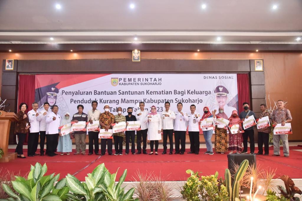 Penyerahan Santunan Kematian Bagi Keluarga Penduduk Miskin Tahap I Tahun 2023 ini, Pemerintah Kabupaten Sukoharjo akan menyerahkan bantuan dengan total alokasi dana sebesar Rp. 5.100.000.000,- (lima milyar seratus juta rupiah) kepada 1.700 (seribu tujuh ratus) orang se Kabupaten Sukoharjo atau masing-masing menerima bantuan sebesar Rp. 3.000.000,- (tiga juta rupiah).